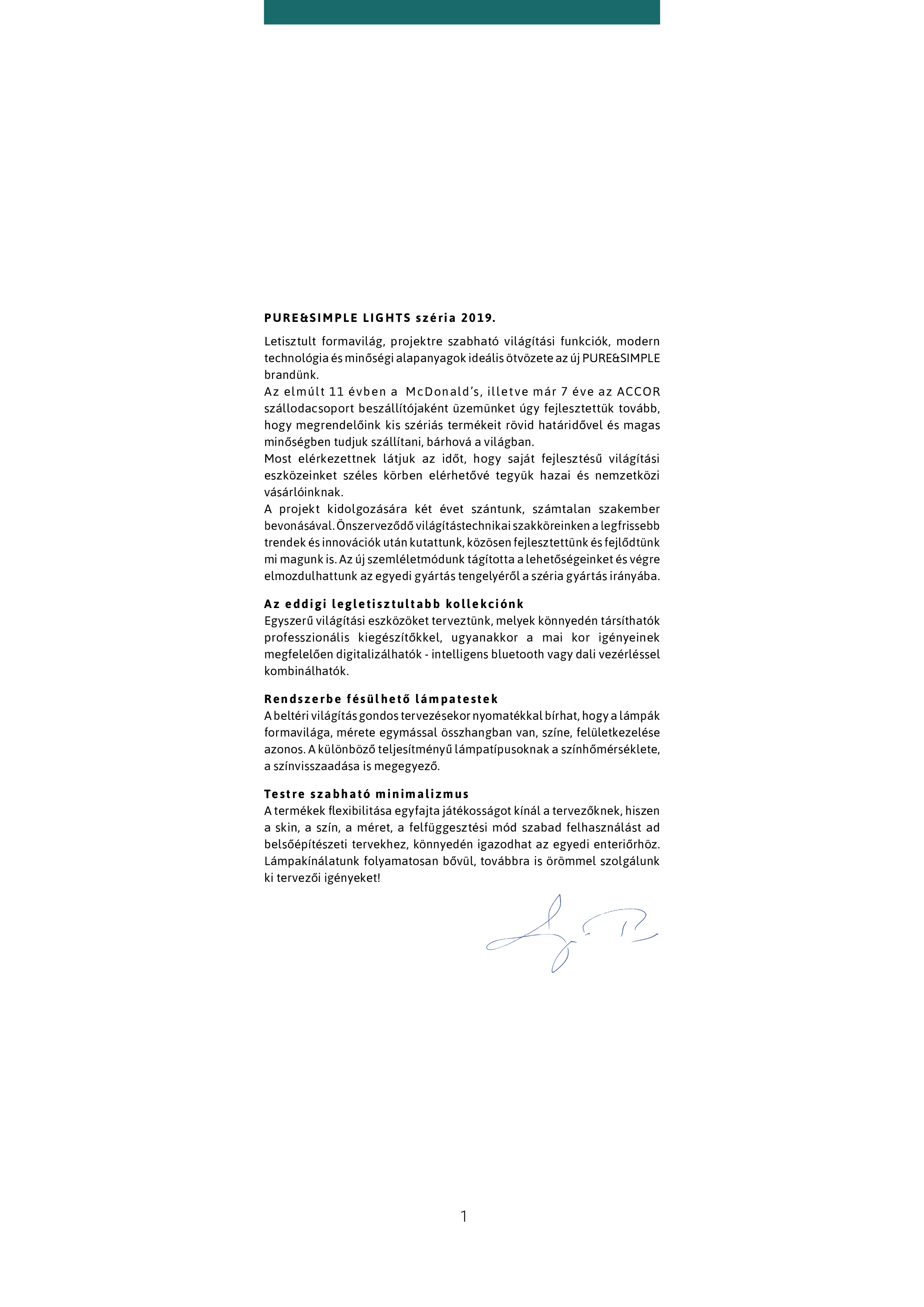 A PURE&SIMPLE család formai letisztultsága könnyedén társítható bármilyen építészeti stílussal, enteriőrrel. A világítótestek személyre, projektre szabhatók – választható a skin, a fényforrás, a méret és digitális kiegészítőkkel tovább fejleszthetőek. A magas minőségű alapanyagok és az egyedi fejlesztésű fényforrások gondoskodnak a kiegyensúlyozottság élményéről és a hosszú élettartamról. Minimál stílusú lámpáinkat irodákba, kereskedelmi- és vendéglátó egységekbe, magánlakásokba illetve minden olyan beltéri helyiségbe ajánljuk, ahol az egységes megjelenésen és a fény minőségén van a fókusz.